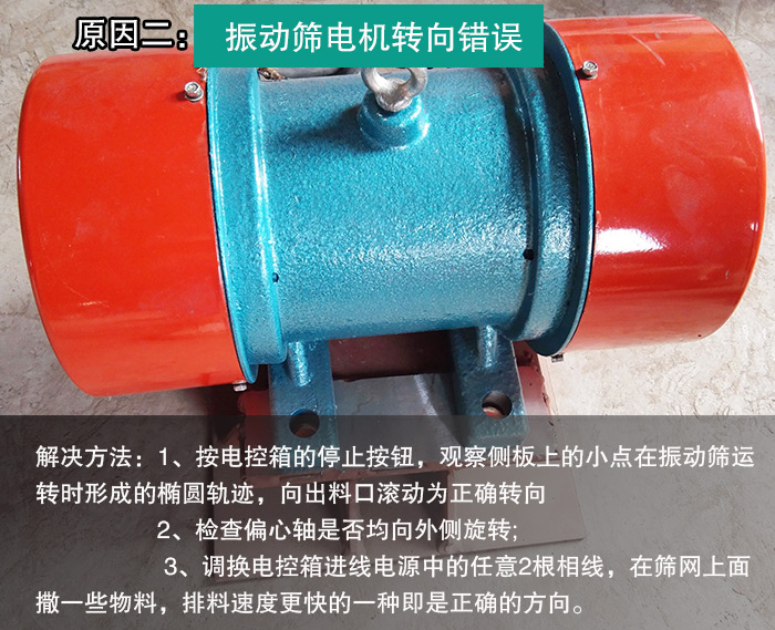 在調試振動電機轉向時,現場操作人員根據以往經驗,認為只要物料往前走就行,但此方法僅適用直線振動篩選機。若電動機錯誤地朝內側旋轉,拋射角雖也是向前45°,但是物料有向后滾動的力,這時向前運移的速度要慢很多,在篩網上停留時間長,甚至導致物料無法排出。